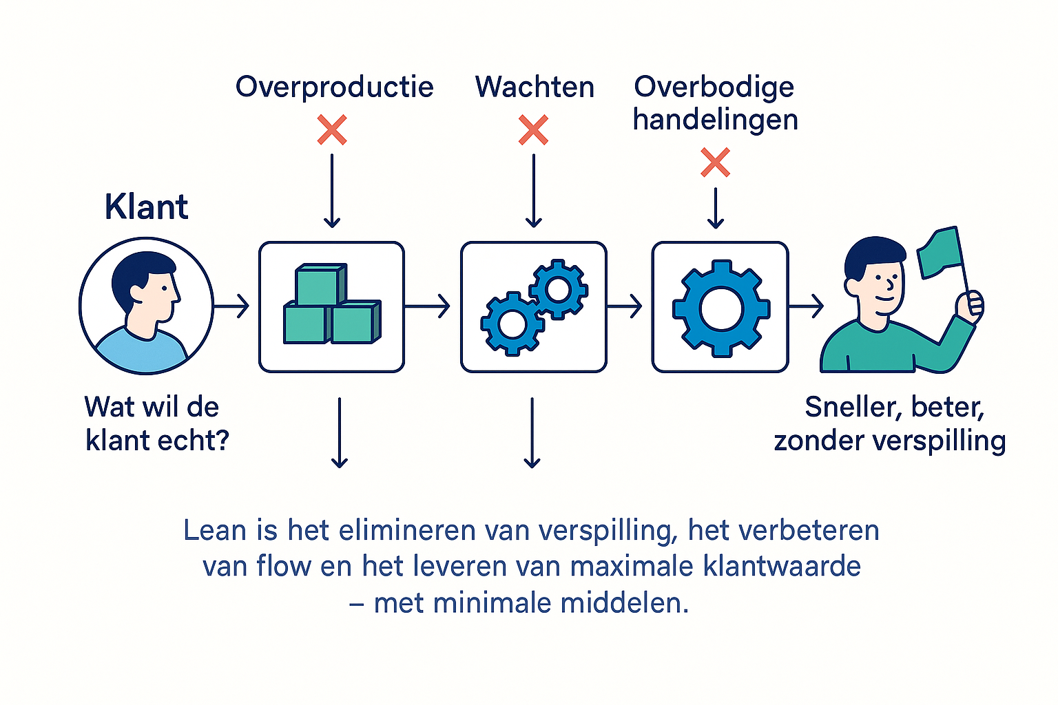 • Lean richt zich op het elimineren van verspilling in processen: tijd, geld, materiaal, handelingen of communicatie die géén waarde toevoegen voor de klant.